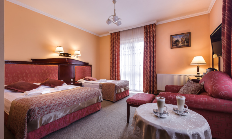Kameralny hotel 3*. Restauracja, bar, basen kryty, sauna fińska, łaźnia parowa, jacuzzi, chata grillowa, bilard, piłkarzyki, parking. Internet WiFi.